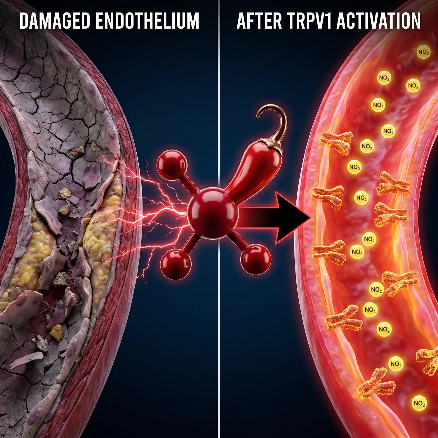 Capsaicin triggers TRPV1 receptors in vessel walls, initiating the repair cascade.